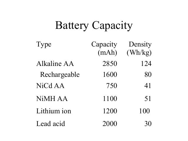 This means that you may not be able to predict how long your electronic device will run just by looking at the capacity rating of a battery. For example AA alkaline batteries typically have a capacity rating of over 2,500 mAh and AA NiMH batteries have rated capacities of only 1,200 to 1,900 mAh. ... Retrieve Doc