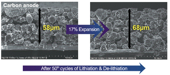 As good as silicon's performance potential is for advanced lithium-ion batteries, there are some complications involving silicon's behavior. The problem lies with silicon's tendency to expand approximately 400% of its original size during lithiation, then reducing to a varying size during de-lithiation. ... Retrieve Doc