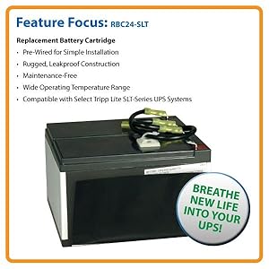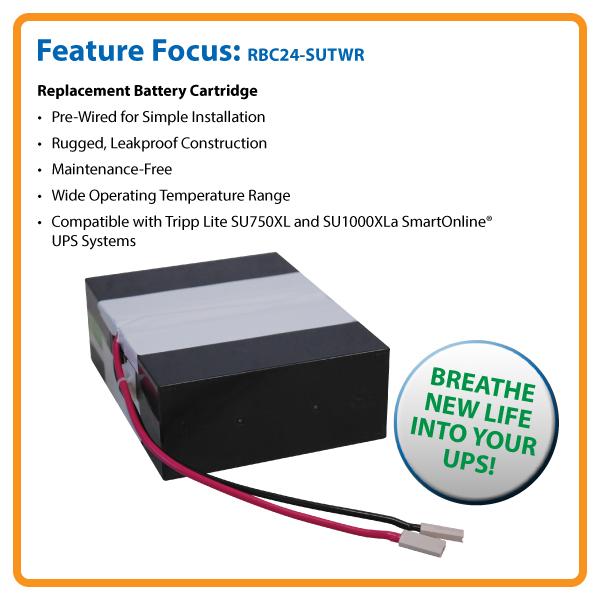 24V Replacement Battery Cartridge for SU1500XL/SU2200XLA Tripp Lite UPS Systems Extend the life of your Tripp Lite SmartOnline UPS! Tripp Lite’s RBC24-SUTWR Premium 24V UPS Replacement Battery Cartridge breathes new life into UPS systems suffering from expired or weak internal batteries. ... Fetch Content
