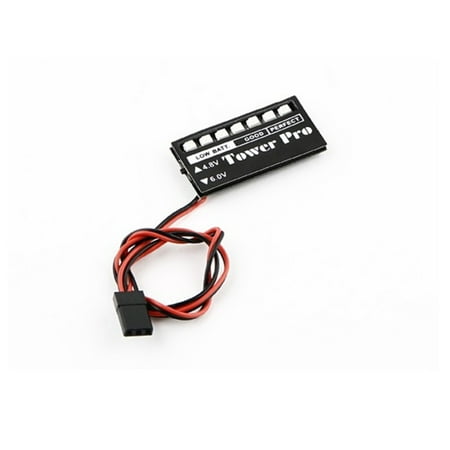 Tower Pro V : Battery checker & monitor for RC models. Plugs into receiver. For 4.8v & 6.0v battery packs. Has 7 LED lights to indicate battery voltage & status. Can adhere to outside of flying model, so you can see it during flight. ... Fetch Doc