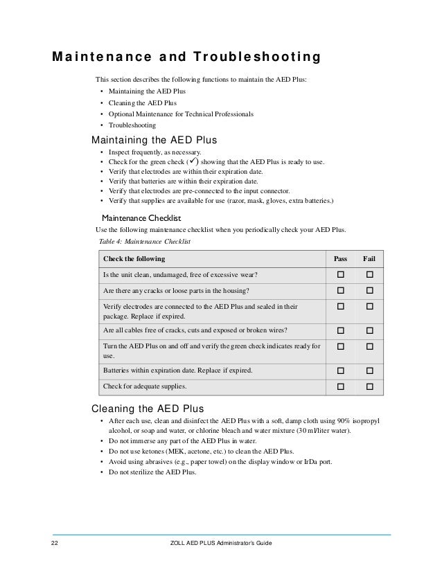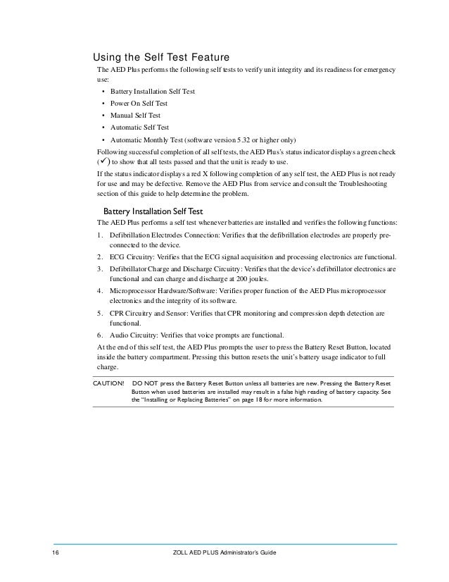 9650-0308-01 Rev. A ZOLL AED Plus Service Manual 1Œ1 Chapter 1 Maintenance Tests This chapter describes the procedures for routine testing of the AED Plus unit. A test typically consists of multiple steps, each of which requires a pass/fail rating. For each step, perform the specified action and then verify that the expected results occur. ... Read Full Source